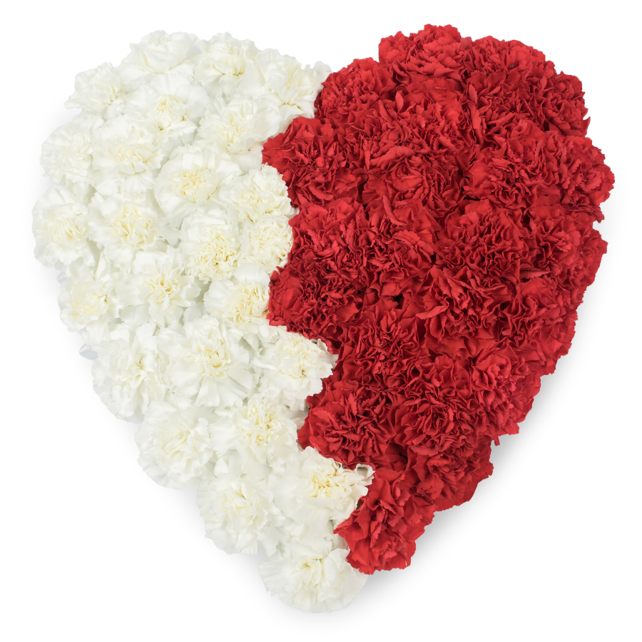 Embrace the elegance of our heart-shaped bouquet, featuring stunning white and red carnations. Each hand-selected flower guarantees exceptional freshness and quality, making it a meaningful gift.